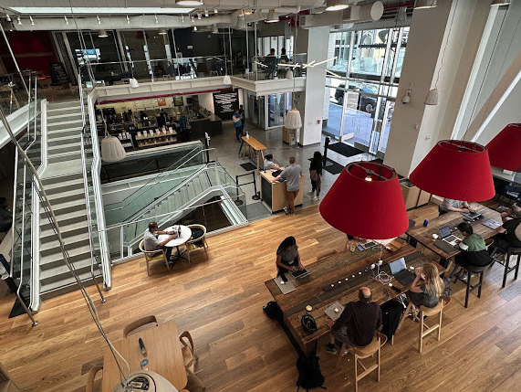 Located in the atrium of LinkedIn building, there’s a public space with long tables and seats for people to cowork. The windows are large from ceiling to floor, and the walls are covered in modern art. Seats aren’t as comfortable, but it’s free!